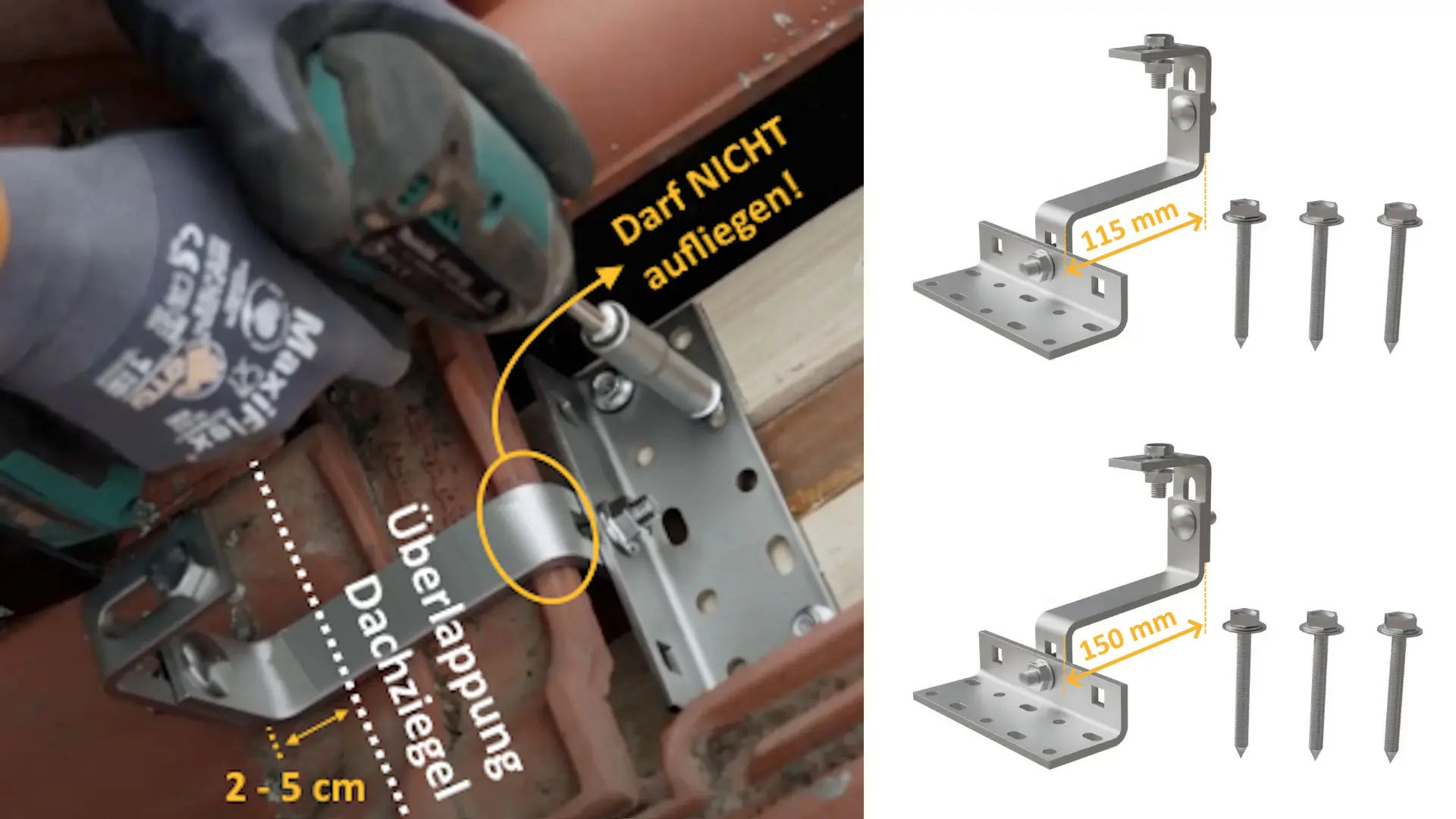 Wichtig: Wenn du Module mit mehr als 2 m² Fläche verbaust, empfehlen wir den Einsatz von zusätzlichen Dachhaken, um die höhere Wind- und Schneelast sicher abzufangen und die mechanische Belastung besser zu verteilen.