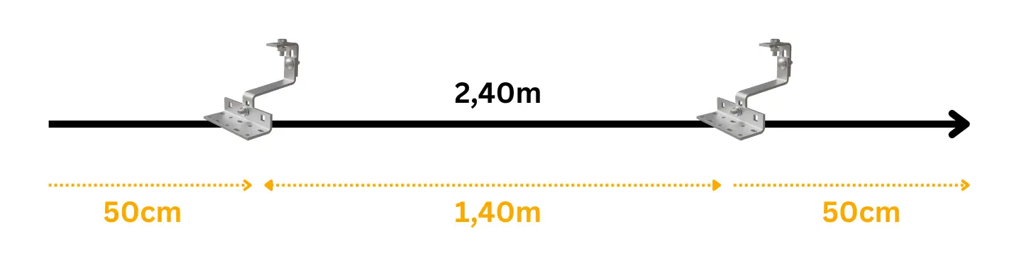 Der maximale Abstand von Dachhaken zu Dachhaken liegt bei 140 cm und die maximale Auskragung (also der Abstand vom letzten Dachhaken zum äußersten Modulrand) liegt bei maximal 50 cm (gilt für die Windlastzonen 1+2 und Schneelastzone 1).